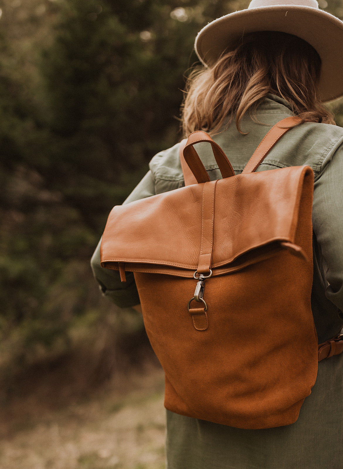 Our leather fold-over bags are a distinctive spin on a classic backpack. With industrial-quality brass hardware and adjustable straps, this bag has been carefully designed to carry all your essentials for life on-the-go while looking sharp.