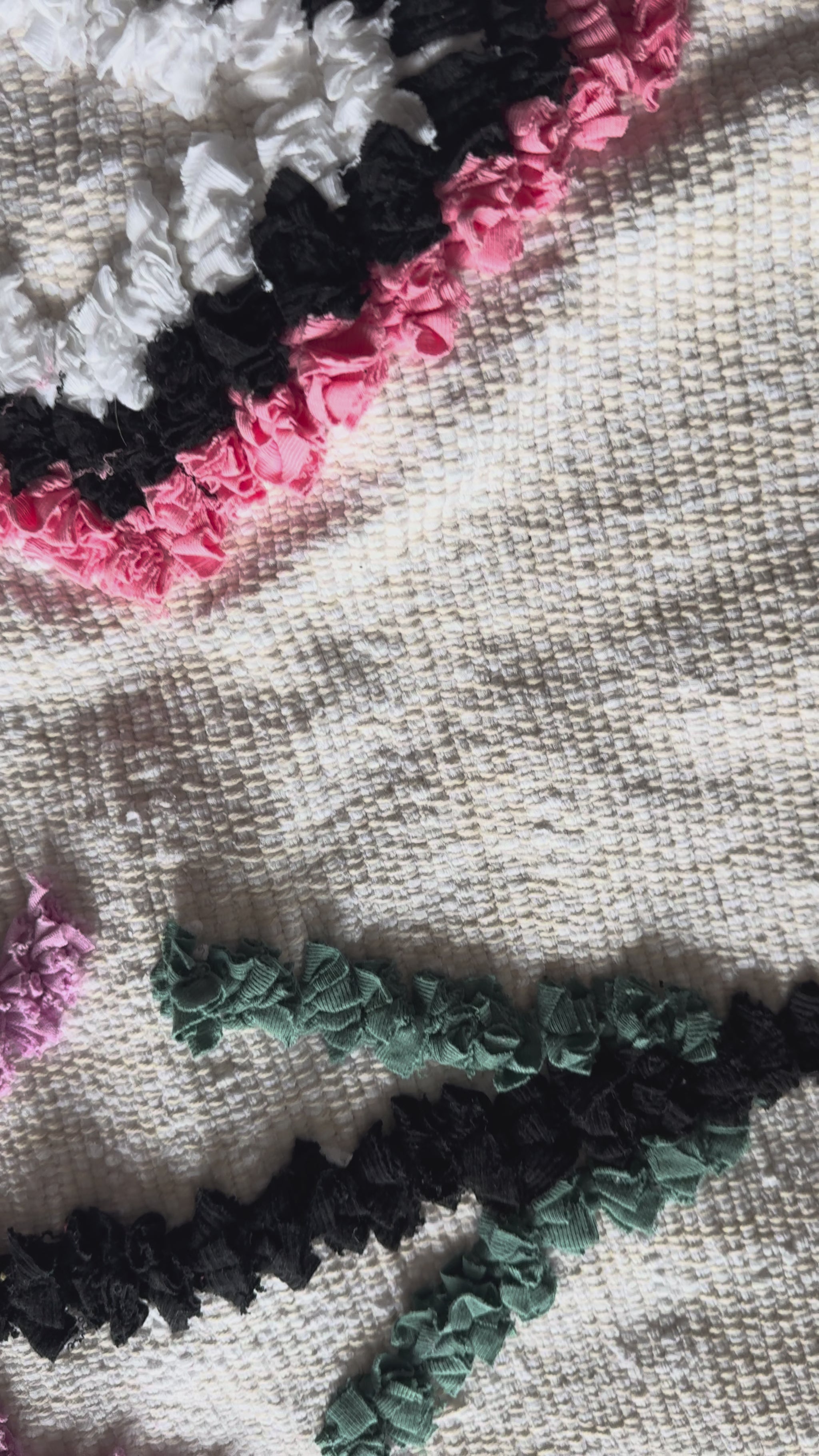 This Moroccan rug is handmade by a group of women who work together to make each rug. They are called Boucherouite rugs and are made of cotton fabric scraps left over from clothing factories.