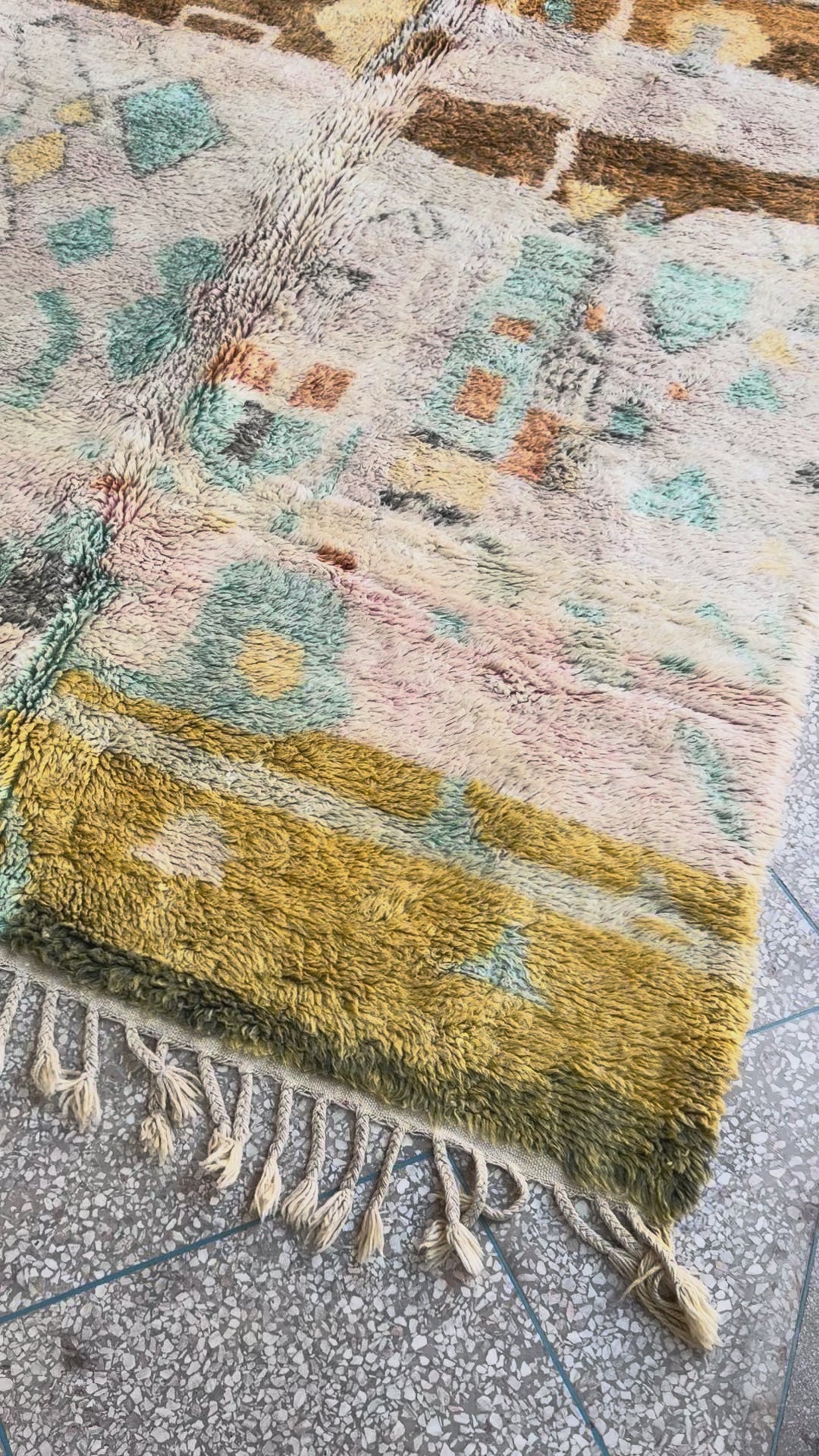 This Moroccan rug is very special! The colours are amazing, from turquoise blue to soft browns, golden yellow, and touches of pink—it’s stunning! A piece of art that would elevate any room in your house. It is very thick, soft, and cozy, and the quality is top-notch!