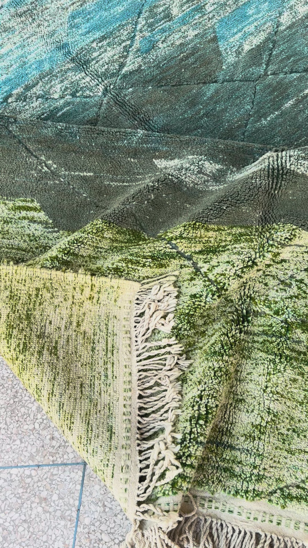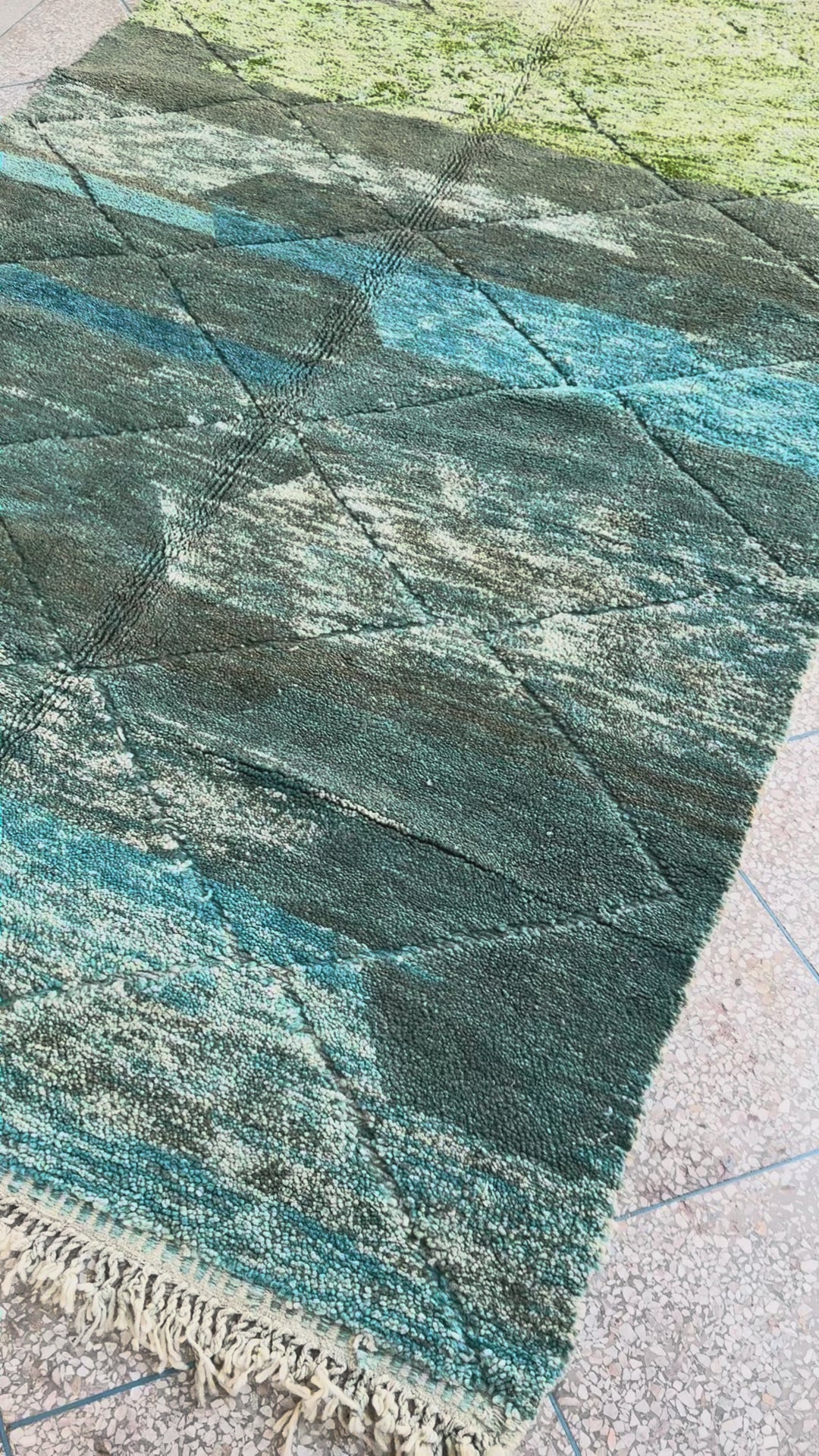 This Moroccan rug is very special! The colours are amazing, from different tones of green and touches of turquoise blue — it’s stunning! A piece of art that would elevate any room in your house. It is very thick, soft, and cozy, and the quality is top-notch!