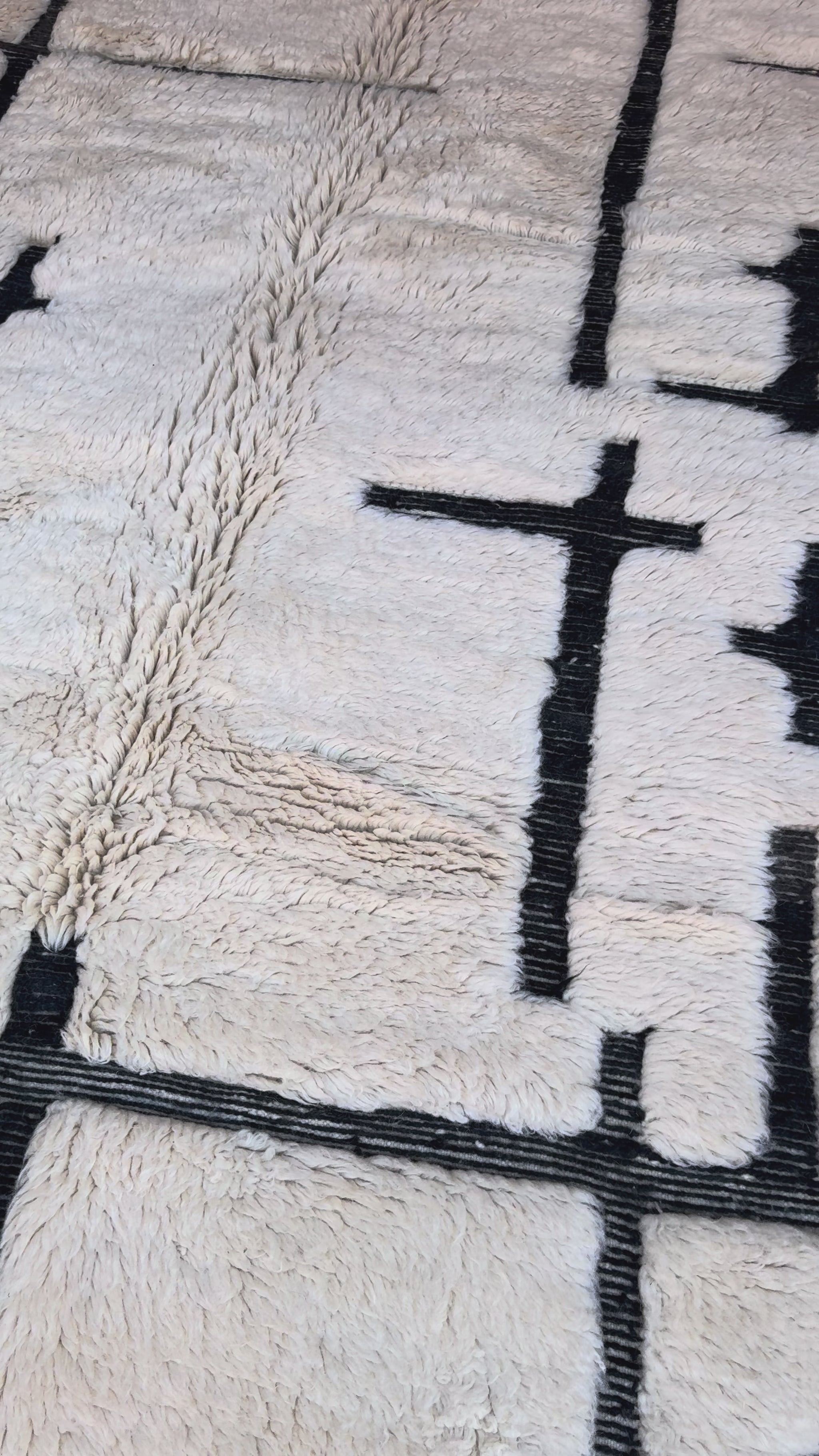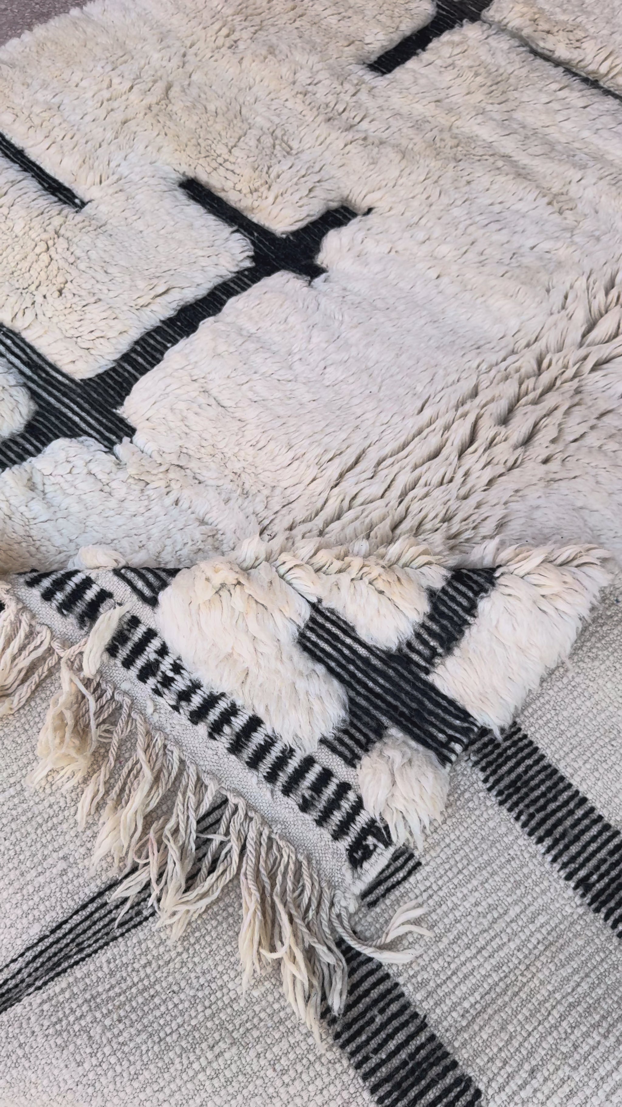 This stunning Moroccan rug has a black engraved design that gives it a modern edge. It’s super thick and cozy, and amazing underfoot! It feels luxurious; unique and one-of-a-kind, we only have one available.