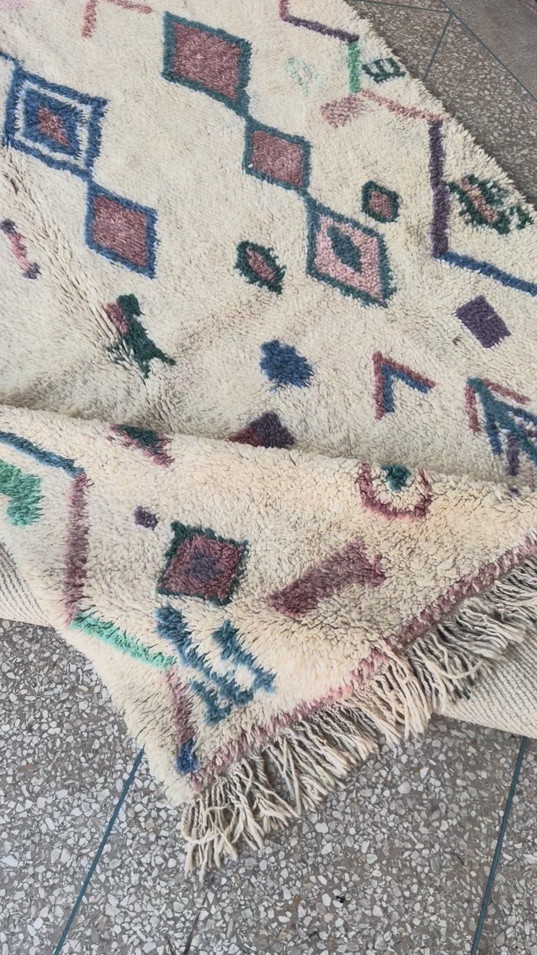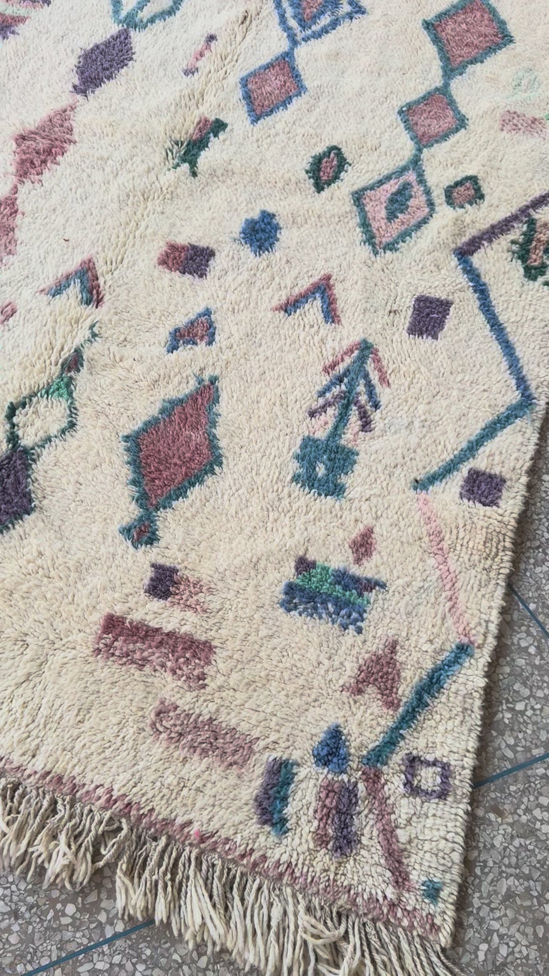 This Moroccan rug features incredible Berber symbols believed to bring good luck and abundance into your home. It’s entirely handmade and one-of-a-kind. It’s made of 100% wool, the hand feel is soft, and it feels super cozy to walk on. It is very thick, cozy, and the quality is top-notch!