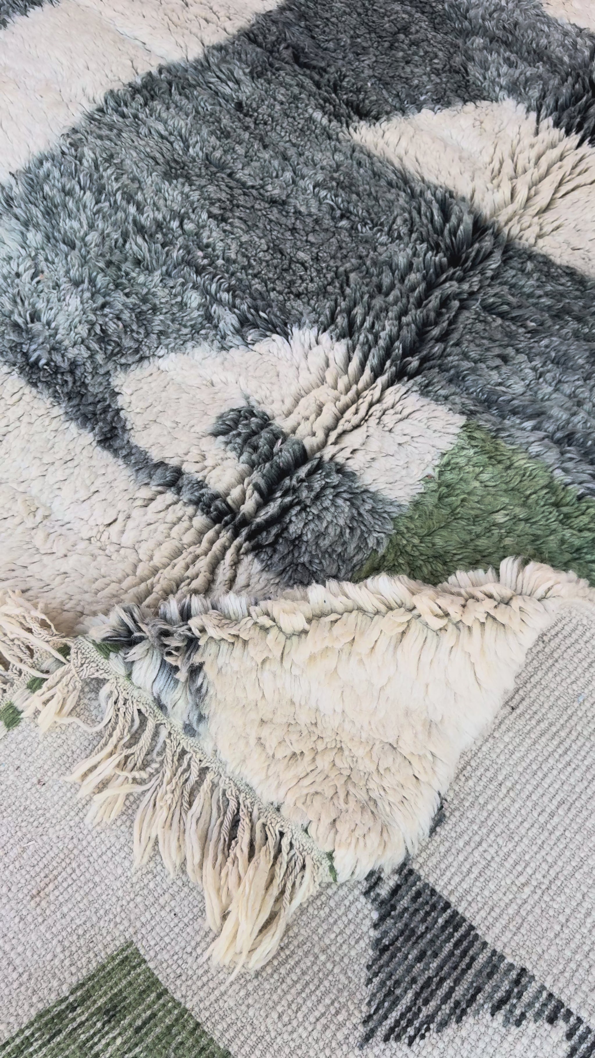 This Moroccan rug is a work of art. A gorgeous abstract design in neutral tones of cream, grey, and green. It’s super thick and cozy, and feels luxurious to walk on. Unique and one-of-a-kind, we only have one available.