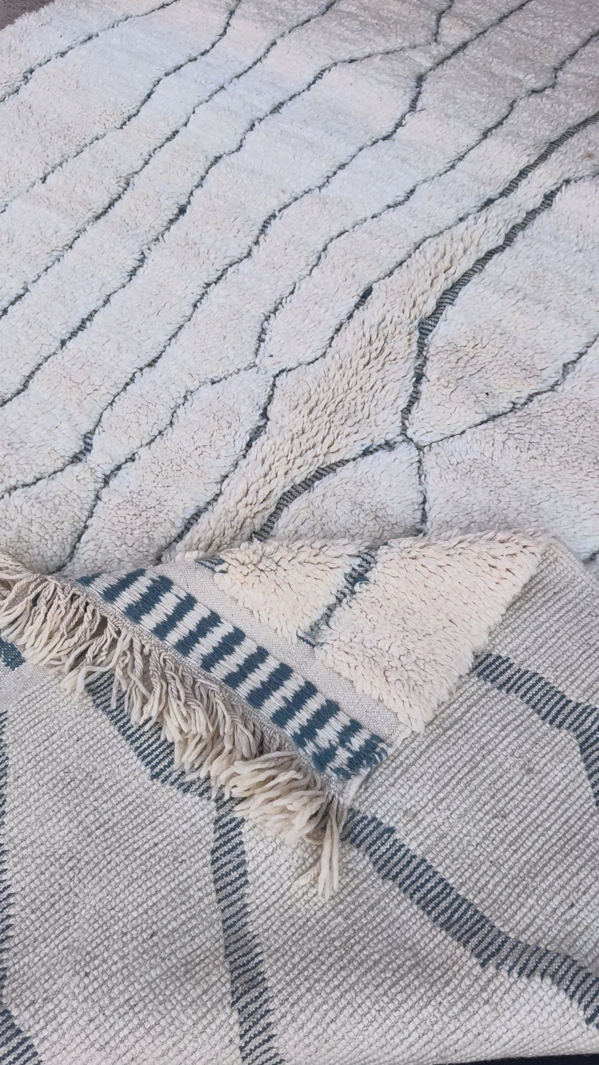 This stunning Moroccan rug has a blue engraved design that gives it a modern edge. It’s super thick and cozy, and so great underfoot! It feels luxurious; unique and one-of-a-kind, we only have one available.