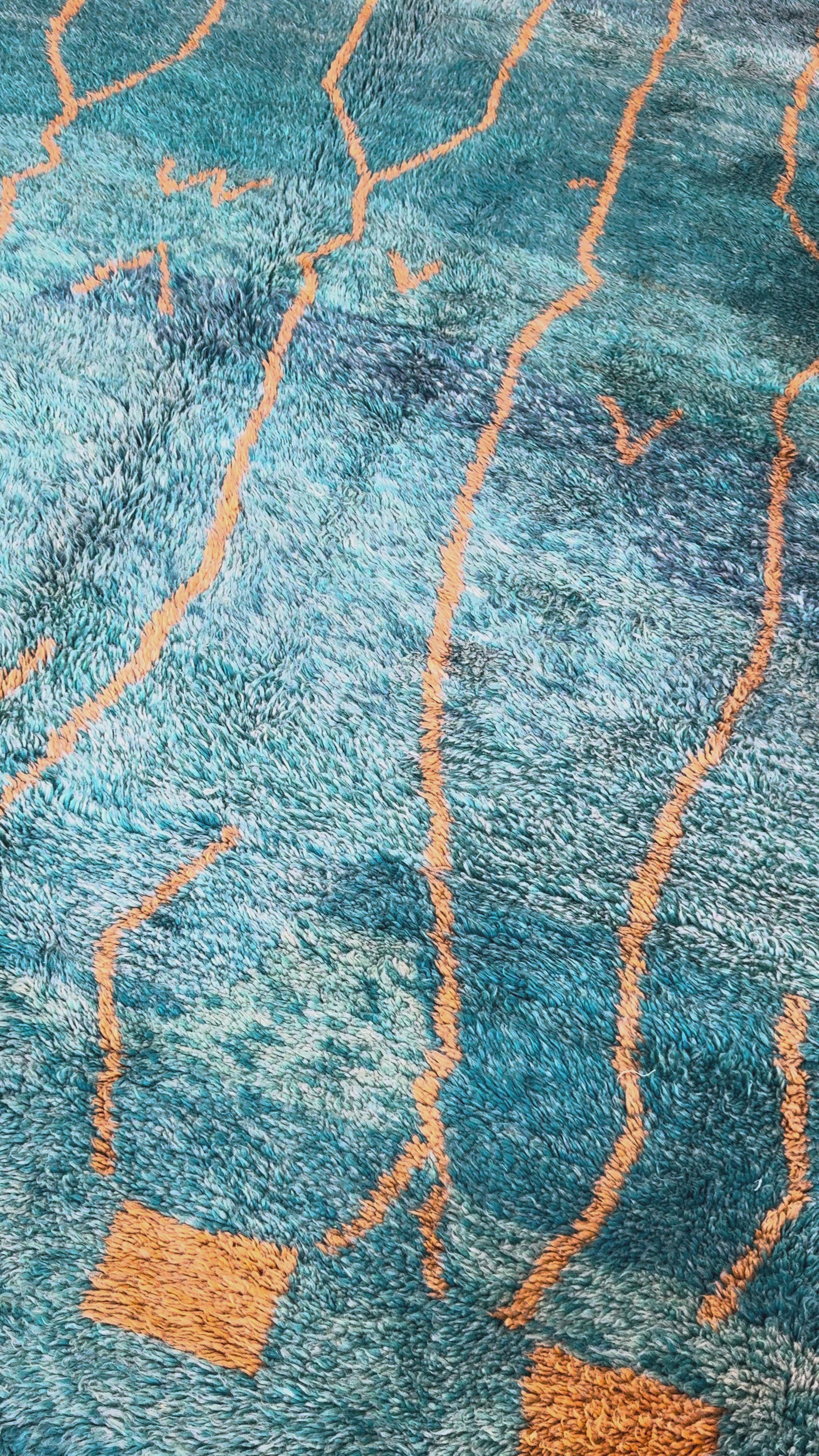 Our Moroccan rugs have the most gorgeous colour palette and patterns! Teal blue/green with orange patterned lines - it’s straight-up amazing! A piece of art that would elevate any room in your house. It is very thick, soft, and cozy, and the quality is top-notch!